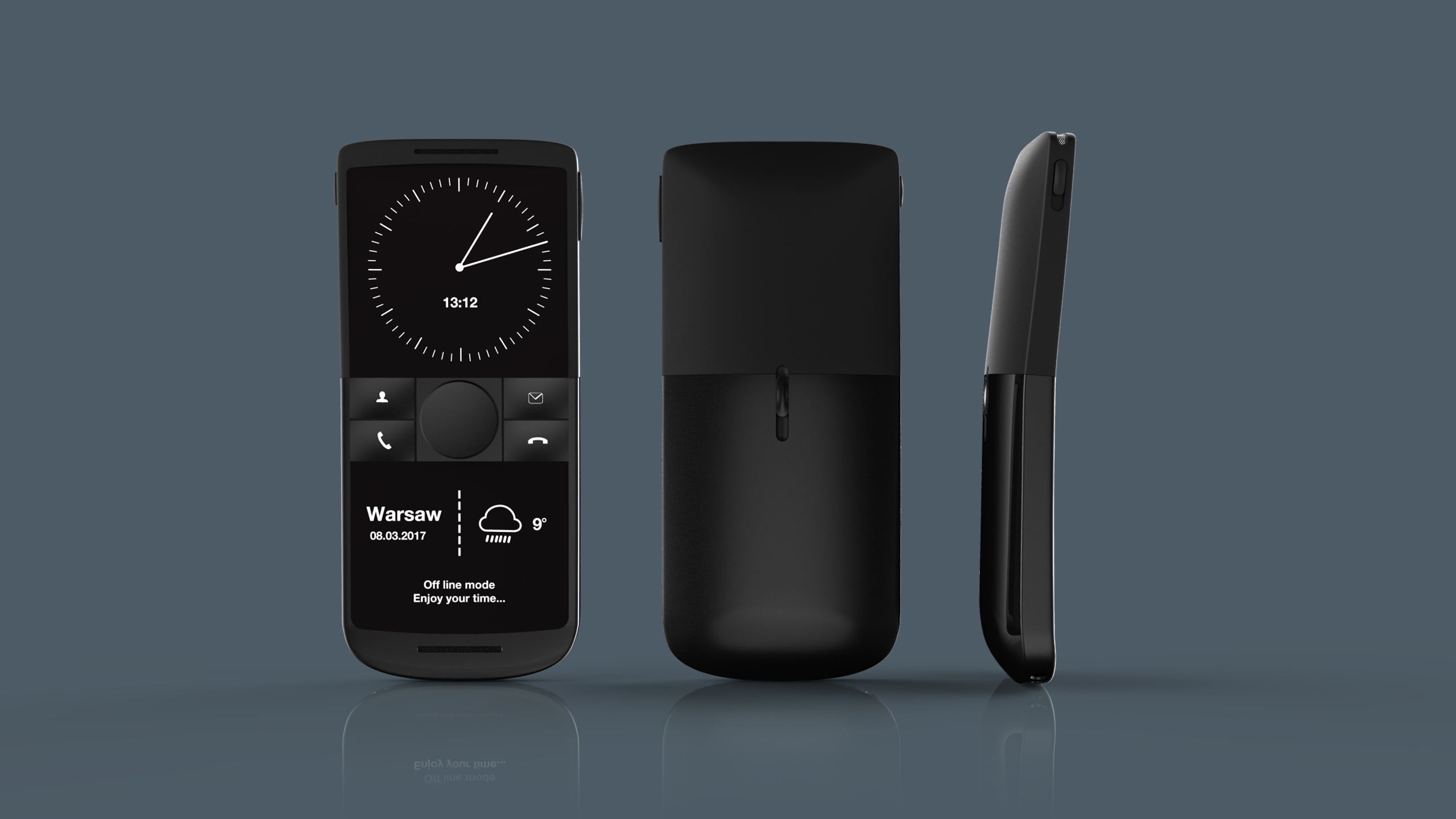 We were commissioned to design a 2G mobile phone like first NOKIA but with the lowest SAR emission. The purpose of this product is to offer "offline life balance", an alternative to time consuming smartphone. We come up with technological strategy to use e-ink screen, divided by manual navigation. The solution perfectly fitted to the client brief. The task was to deliver a low energy phone with keypad and visible offline switch, which we placed on the back to emphasize the importance of the feature. We aim to design a beautiful piece of electronic with exciting technology to attract "early adopters"and functions for those who want's to remain in balance.