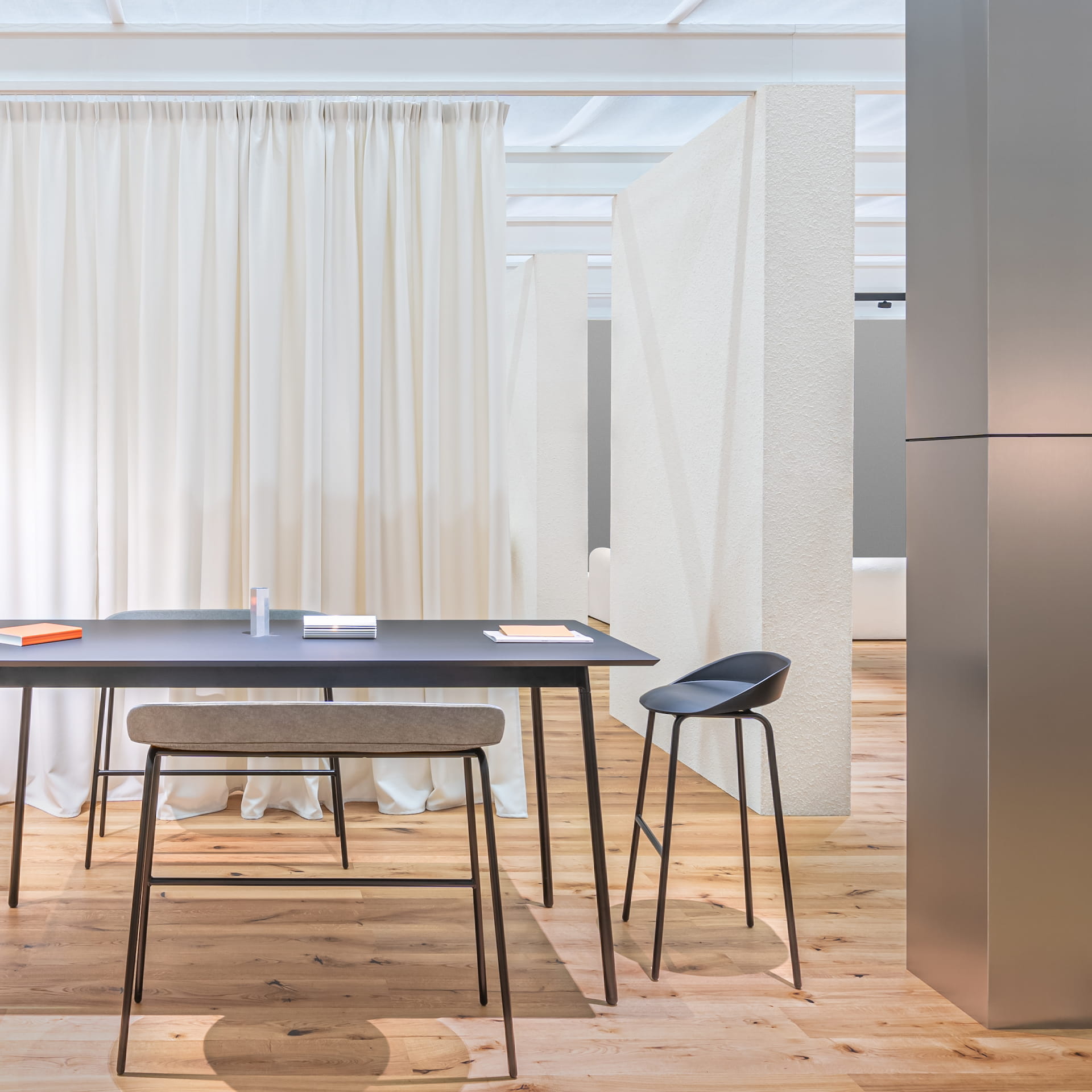 Orgatec is the leading trade fair for the office industry. Its aim is to present the new vision of the working culture, environment and process. We wanted to create an atmosphere of a familiar and friendly space evoking the feeling of a modern apartment, where work, relaxation, conversation over coffee or the telephone finds its natural place . The result was a minimalist stand divided into zones corresponding to functional areas in the office: a lounge area, a meeting space, a waiting area, workstations and a canteen equipped with high tables.